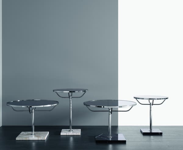 A classic round table in chrome, with a larger top diameter than its smaller counterpart. Featuring manual height adjustment and a marble base.